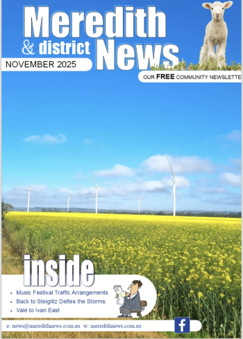 The Meredith and District News website welcomes you. Run by volunteers, we publish a free newsletter on the first Thursday of each month which circulates throughout Meredith, Elaine, Lethbridge and surrounding districts; an area that lies midway between the regional cities of Geelong and Ballarat, Victoria Australia.