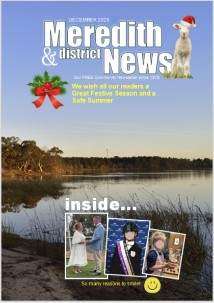The Meredith and District News website welcomes you. Run by volunteers, we publish a free newsletter on the first Thursday of each month which circulates throughout Meredith, Elaine, Lethbridge and surrounding districts; an area that lies midway between the regional cities of Geelong and Ballarat, Victoria Australia.